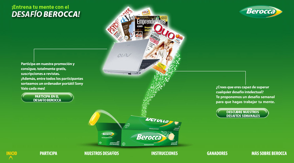 Me entero a través de Bajo la linea , una de mis lecturas diarias, que Berocca, un complejo vitamínico que utilizan mucho los estudiantes en épocas de examenes, está desarrollando una campaña de publicidad denominada Desafío Berocca, en la cual, através de la correcta respuesta de acertijo, problemas de lógica…el cliente puede tener acceso a premios muy interesantes como : Sony Vaio y suscripción a una revista (Quo, DeViajes, Psychologies o Emprendedores) como regalo seguro para los que acumulen varios packs.
